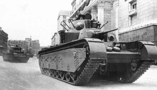 Как ни парадоксально, но Т-35, который советские художники любили изображать на агитационных материалах времен Великой Отечественной войны к 1941 году два года, как был снят с производства. Всего в СССР было выпущена 61 машина этой модели тяжелых танков. Главным его отличием от других боевых машин СССР было наличие сразу пяти боевых башен. Во время военных парадов 1930-х годов, действительно, Т-35 выглядел несокрушимой громадой. В то же время необходимо отметить, что если свои много башенные танки немцы безуспешно пытались поставить на серийное производство только в конце войны, то в СССР они массово производились, начиная с 1933 года. При этом, как ни удивительно это звучит, но самый мощный танк Советского Союза в период с 1933 по 1939 года, когда он был снят с производства, в военных действиях не участвовал. Увидеть его можно было только на Красной площади во время парадов или на учениях.