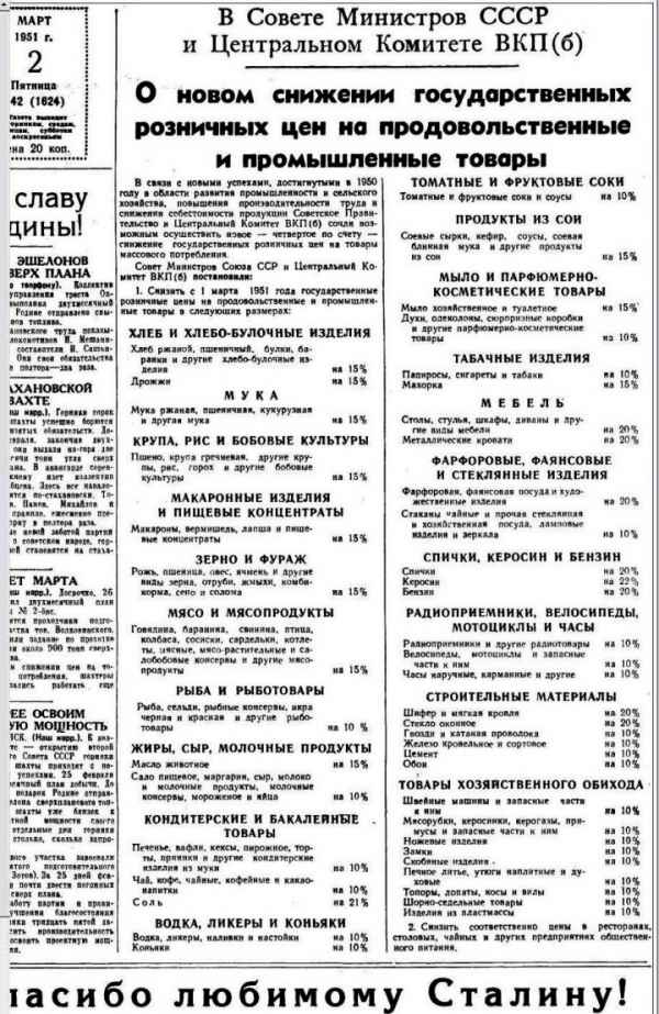 Мало того, в СССР ещё и цены снижали 2 раза в год на 10-20% (!!!) Лаврентий Берия: «Советское Правительство проводит политику систематического снижения цен на товары массового потребления. В марте этого [1951-го] года было осуществлено новое, четвёртое за последние годы, снижение государственных розничных цен на продовольственные и промышленные товары, что обеспечило дальнейший рост реальной заработной платы рабочих и служащих и сокращение расходов крестьян на покупку удешевлённых промышленных товаров».
