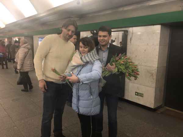 В метро «Гостиный двор» милые дамы получали тюльпаны от братьев Запашных и Сергея Боярского. В трамвае, курсирующем по улице Савушкина, такой приятный сюрприз жительниц города ждал от композитора Игоря Корнелюка. А около театра Ленсовета цветы раздавали Михаил Боярский и Сергей Мигицко.