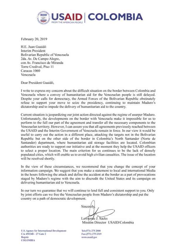 Судя по упоминаемым в письме "необходимым компонентам", можно предположить, что атака, в которой планируется обвинить Мадуро, будет проведена с использованием химического либо биологического оружия. После чего Гуайдо отведена ведущая роль обличителя кровавого тирана на новом этапе информационной войны. Как следствие, освобождение от диктатуры и победа демократии в Венесуэле. При этом провокация может сопровождаться жертвами среди колумбийского населения, что нимало не смущает американских борцов за свободу Венесуэлы. Вероятно, роль представителей колумбийского посольства в Венесуэле, как связующего звена между USAID и Гуайдо, стала одной из причин, по которым Мадуро принял решение выдворить их из страны.