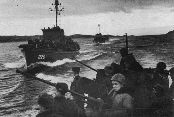 В 8 часов утра 10 января пехотинцы стали высаживаться в ледяную воду, теряя оружие и боеприпасы. Немецкие самолёты при этом обстреливали флотилию с воздуха. Советская же авиация, которая должна была прикрывать операцию, на месте так и не появилась.