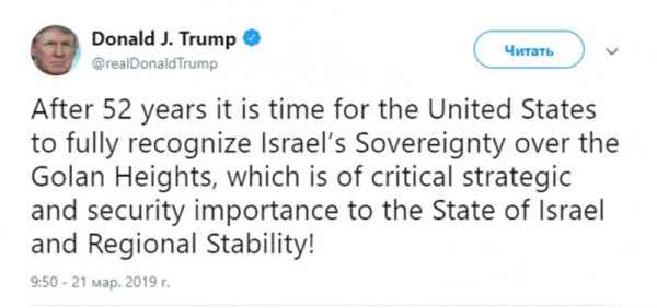 «Спустя 52 года для Соединенных Штатов пришло время полностью признать суверенитет Израиля над Голанскими высотами, которые имеют критическую, стратегическую важность и важность в сфере безопасности для государства Израиля и региональной стабильности».