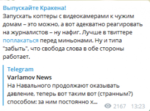 Телеграм-канал "Выпускайте Кракена" опубликовал пост, в котором высмеял истерики Навального из-за журналистов.
