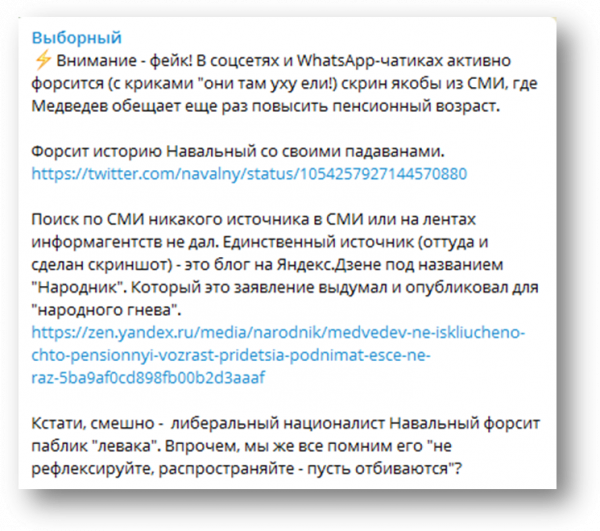 Или нашумевшая «новость», которую он сам же и придумал о якобы ещё одном повышении пенсионного возраста. Наглости у этого персонажа не занимать, если он решается не просто перевирать информацию СМИ, а выдумывать за них.