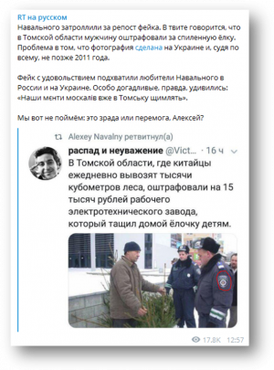 Подобных провалов у Навального и его дружков целый набор. Вот, к примеру, вброс о штрафе за спиленную ёлочку. Якобы китайцам лес вывозить можно, а электрику ёлку взять нельзя. Правда, блогеру стоило бы хотя бы посмотреть на шевроны органов правопорядка, прежде чем кидать эту лажу.