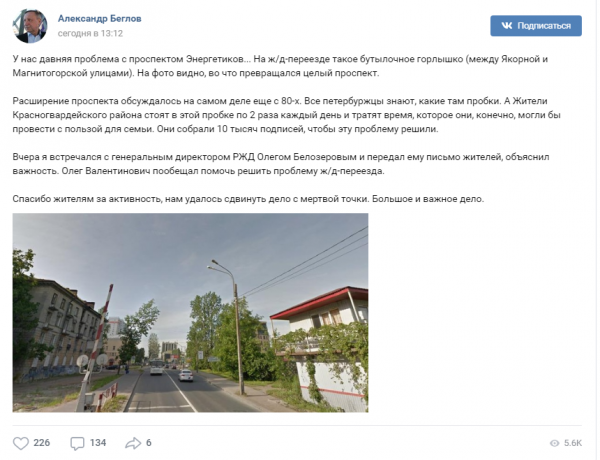 Из-за этого жители района ежедневно стоят там в пробках. Для того чтобы сдвинуть дело с мертвой точки они даже собрали 10 000 подписей. Беглов услышал горожан и встретился с Белозеровым, который, в свою очередь, пообещал помочь. Об этом врио губернатора написал на своей страничке в «ВКонтакте».