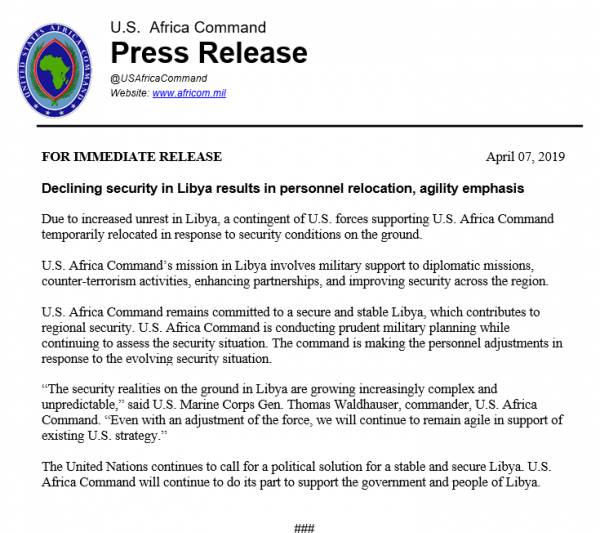Африканское командование ВС США (AFRICOM) вывело свой контингент из Ливии в связи с ухудшением ситуации с безопасностью в стране, охарактеризовав этот шаг как "разумное военное планирование".