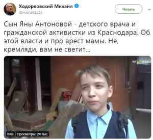 Сейчас в качестве оружия эксплуатируется ребенок Яны Антоновой. После обысков в квартире активистки Михаил Ходорковский раскритиковал ситуацию в России. МБХ Медиа даже записало интервью с мальчиком.
