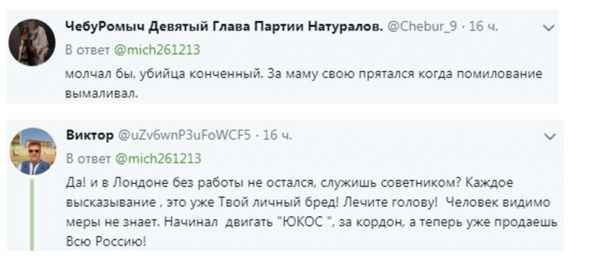 А на истеричную реакцию Ходорковского уже откликнулись пользователи соцсети. Они упрекнули Ходорковского за переход на личности, ложь и клевету в обслуживании враждебной политики Запада, а также нелицеприятно высказались о личности самого олигарха.