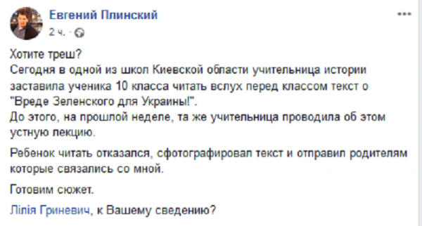 «Хотите треш? Сегодня в одной из школ Киевской области учительница истории заставила ученика 10 класса читать вслух перед классом текст о "Вреде Зеленского для Украины!". До этого, на прошлой неделе, та же учительница проводила об этом устную лекцию», — написал на своей странице в Facebook журналист телеканала «1+1» Евгений Плинский.