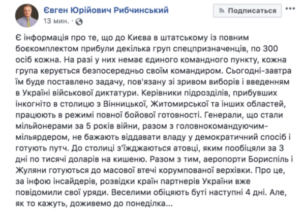 По данным Рыбчинского, с целью сорвать выборы президента Украины в Киев прибыли несколько групп спецназовцев, по 300 человек а каждой. Бойцы одеты в штатское и имеют полный боекомплект оружия.