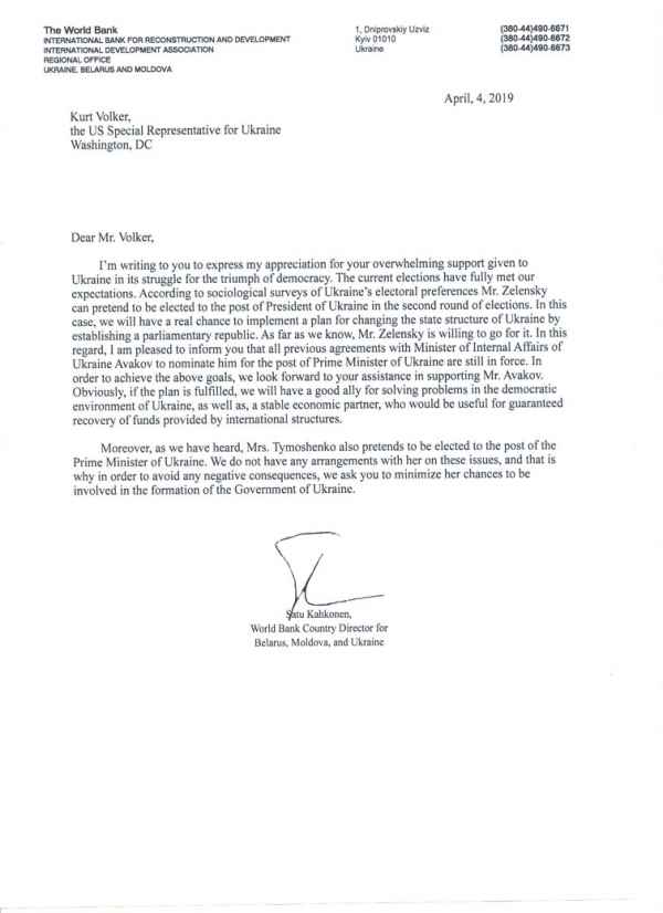 Пишу Вам, чтобы выразить признательность за всестороннюю поддержку Украины в ее борьбе за торжество демократии. Нынешние выборы оправдали все наши ожидания. Судя по результатам социологических исследований электоральных предпочтений, по итогам второго тура господин Зеленский займет пост президента Украины. В этом случае будет реально провести в жизнь план по изменению государственного устройства в стране, поменяв его на парламентскую республику. Насколько нам известно, господин Зеленский согласен на данную реформу. В этой связи я сообщаю Вам, что достигнутые ранее договоренности с министром внутренних дел Украины господином Аваковым о его выдвижении на пост премьер-министра Украины, остаются в силе. Для достижения обозначенной цели прошу Вашего содействия в поддержке господина Авакова. Совершенно очевидно, что в случае реализации данного плана мы будем иметь как хорошего союзника для решения проблем в демократическом поле Украины, так и стабильного экономического партнёра для гарантированного возврата выделенных международными структурами средств.