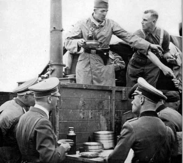 Питание, как это и полагается, было трехразовым: довольно скромный завтрак, сытный обед и небольшой ужин. Как пишет Д. Вествуд в работе «Немецкий пехотинец на Восточном фронте, 1941—1943», половину дневной нормы калорий солдаты потребляли именно в обед, так что этого приема пищи бойцы особенно ждали. Кстати, солдатам на передовой выдавали больше еды («пайки 1-го типа»), служащие в тылу получали меньше — это касалось и раненых. Конечно, для советских воинов это было удивительно, в советских госпиталях пайки были не хуже, а даже лучше фронтовых, а питание включало в себя и вина, и ликеры.