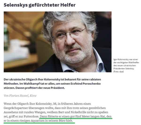 «Украинский олигарх Игорь Коломойский известен благодаря своим отчаянным методам. В ходе избирательной кампании он делал все для свержения своего заклятого врага Порошенко, из чего извлекал выгоду новый президент. Раньше, когда Коломойский хотел убедить своего собеседника, который не поддавался на его приличный внешний вид, он брал кормушку и кормил почти пятиметровую акулу, которая содержалась в огромном аквариуме в офисе олигарха», - пишет Süddeutsche Zeitung.