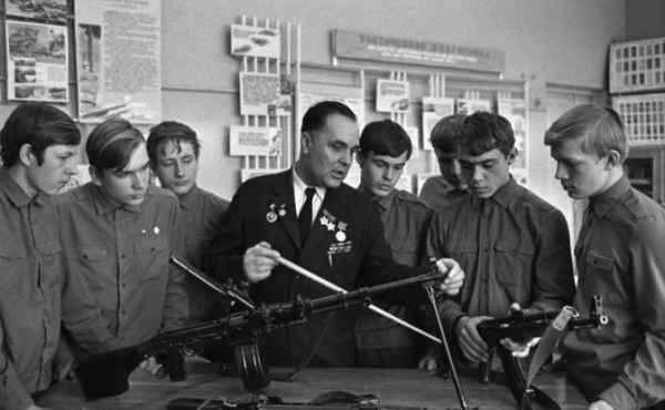 На фото: военный руководитель школы Н.Д. Несёса во время проведения занятий для учеников девятых классов по изучению 7,62-мм пулемета Калашникова, 1973 год (Фото: Кузьмин Валентин/ТАСС)