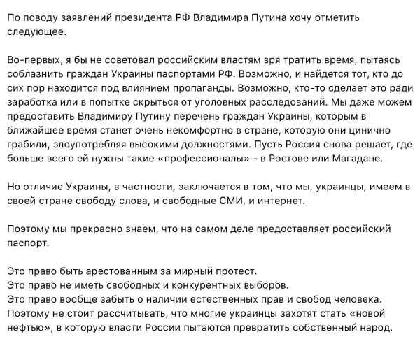 Зеленский заявил в Facebook, что «не советует» России «зря тратить время, пытаясь соблазнить граждан Украины» российскими паспортами. Он не исключил, что найдутся те, кто готов получить российское гражданство из-за «пропаганды», желания заработать или «в попытке скрыться от уголовных расследований».