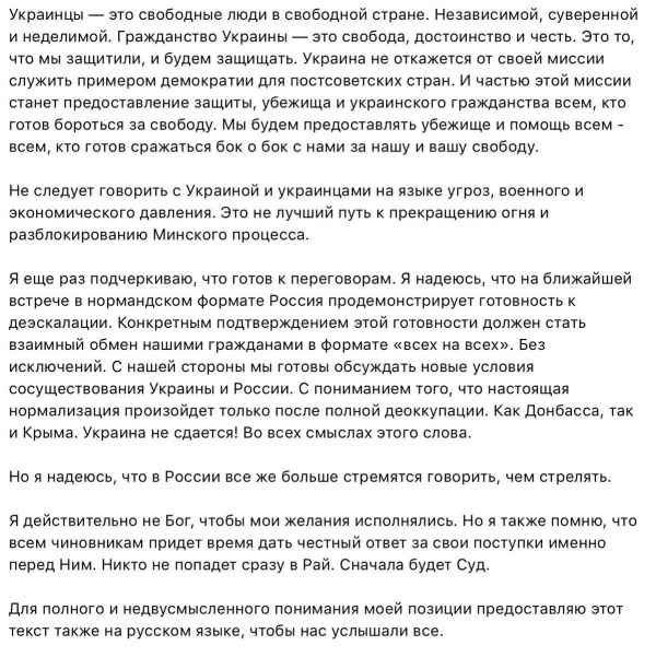 Зеленский предложил «взаимный обмен нашими гражданами в формате «всех на всех», а также заявил о готовности «обсуждать новые условия сосуществования» двух стран. При этом он подчеркнул, что «настоящая нормализация» возможна только при условии получения Украиной контроля над Донбассом и Крымом.