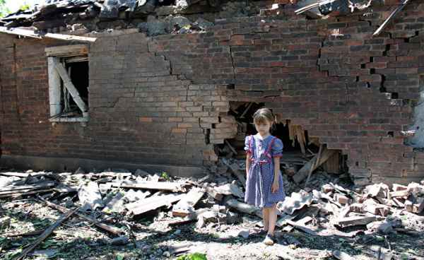 Бойцы ополчения Донбасса и дети в городе Снежное