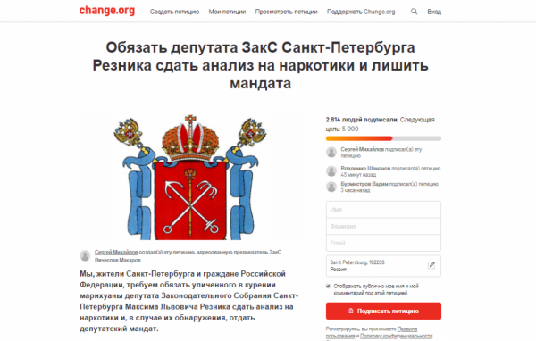 Жители Петербурга возмутились таким поведением депутата. Они создали петицию с требованием проверить его на наркотики и лишить мандата, если медицинский анализ подтвердит то, что Резник употребляет запрещенные вещества.