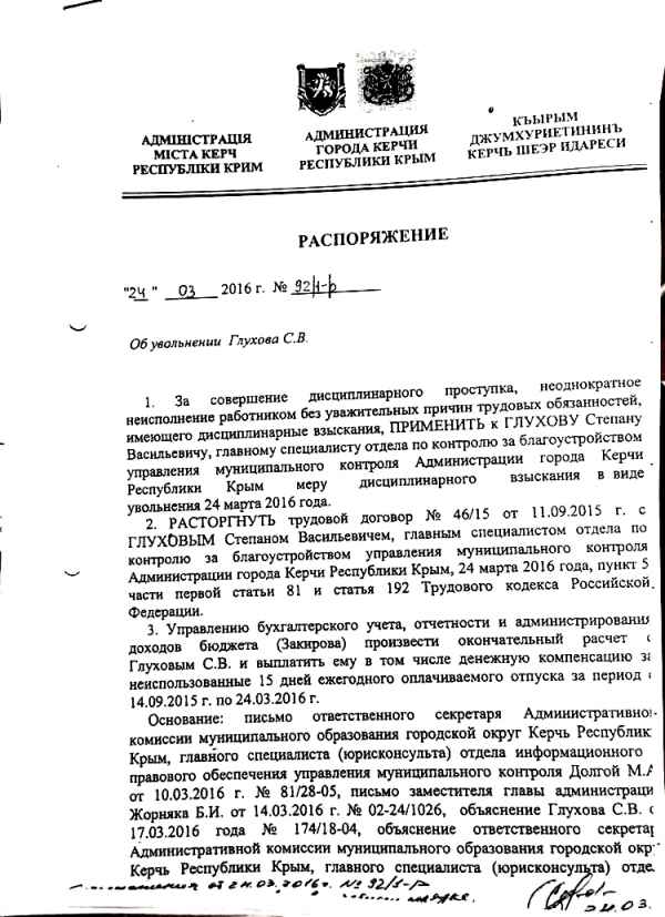 В 2016 году Степана Глухова уволили с должности руководителя муниципального контроля за совершение дисциплинарного проступка. Источники в администрации Керчи сообщали, что бывшего чиновника уволили за шантаж и вымогательство никем неучтенных поборов, которыми он успел обложить два десятка предпринимателей, занимающихся розничной торговлей.