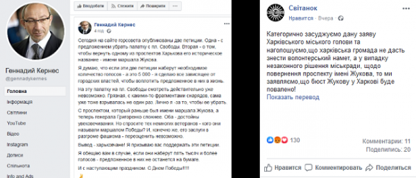 «Категорически осуждаем данное заявление городского головы и подчеркиваем, что харьковская громада не даст снести волонтерскую палатку, а в случае незаконного решения горсовета по возвращению проспекту имени Жукова бюст Жукову в Харькове будет повален!» — сказано в сообщении националистов на их странице в Facebook.