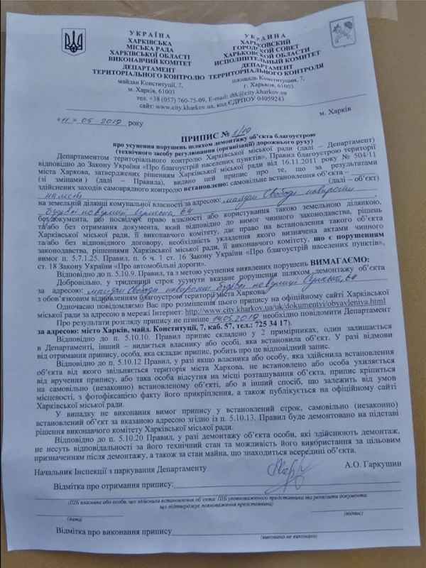 Об этом свидетельствует предписание от Департамента территориального контроля Харьковского городского совета.
