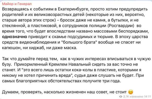 Авторы военного паблика "Майор и Генерал" в Telegram обратились к родителям протестующих в Екатеринбурге. Они отметили, что за нападение на правоохранителей в Екатеринбурге рано или поздно придётся отвечать. Общий посыл послания, сводимый к тезису "и не говорите, что не предупреждали", гласит: бесчинства однозначно приведут к скамье подсудимых.