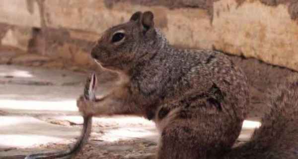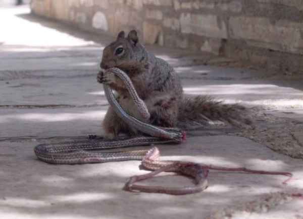 Уильяму Леггетту, рейнджеру в национальном парке Гваделупских гор на западе Техаса, удалось поймать на камеру удивительное столкновение двух лесных жителей. После непродолжительного поединка скалистый суслик — близкий родственник знакомых нам белок — схватил обеими лапами скалистую змею и начал… пожирать ее заживо. Да-да, прожорливый грызун буквально распотрошил своего врага, оставив от него лишь чешую и малопривлекательные внутренности.
