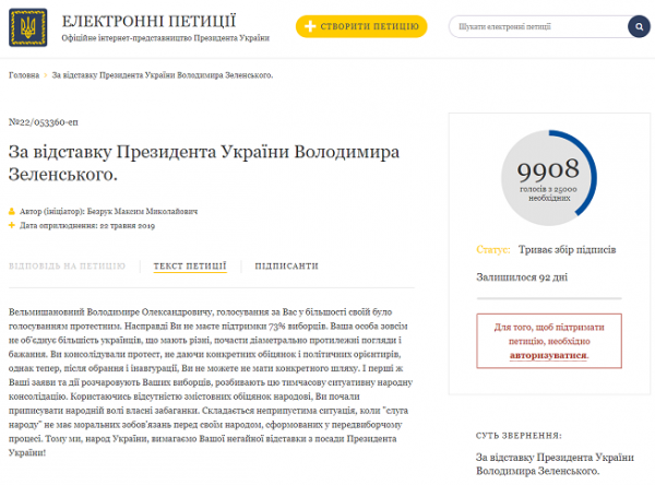 Вчера, 22 мая, на сайте президента Украины зарегистрирована электронная петиция за отставку Владимира Зеленского, которая по состоянию на 11:00 23 мая набрала 9908 голосов из необходимых для ее рассмотрения главой государства 25000.