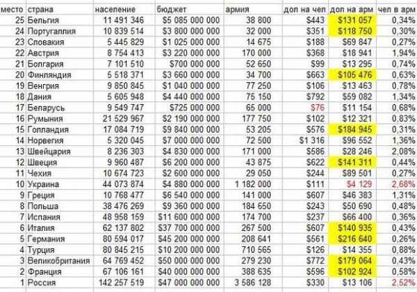 Блогер сделал таблицу с данными по военному бюджету и расходам на каждого армейца (графа «дол на арм»). По этому показателю Беларусь находится в конце списка: в пересчете на каждого солдата тратится в 15 раз меньше, чем в Великобритании. Меньше всего тратят в Украине: всего по четыре тысячи долларов на «штык».