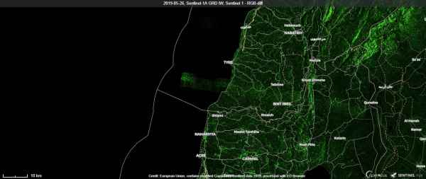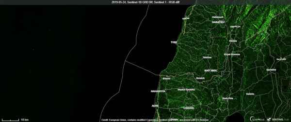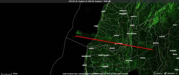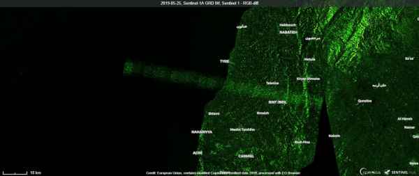 Спутниковые данные, полученные космическим аппаратом «Sentinel 1», позволили выявить на территории Израиля и соседнего Ливана необычную аномалию. По оценкам специалистов, речь может идти о работе одного из комплексов РЭБ, причём, судя по всему, сигнал исходит из района сирийского населённого пункта Эль-Кунейтра.