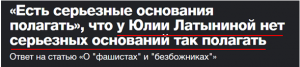 Так что все недожурналисты «Новой газеты» хороши. Другое дело, что Латынина завралась уже до такой степени, что даже коллеги по лживому СМИ обвиняют ее в недостоверности фактов и бездоказательных заявлениях. Пора бы Юлии пересмотреть свою работу и, быть может, стать нормальным журналистом. Хотя с ее психическими проблемами это маловероятно.