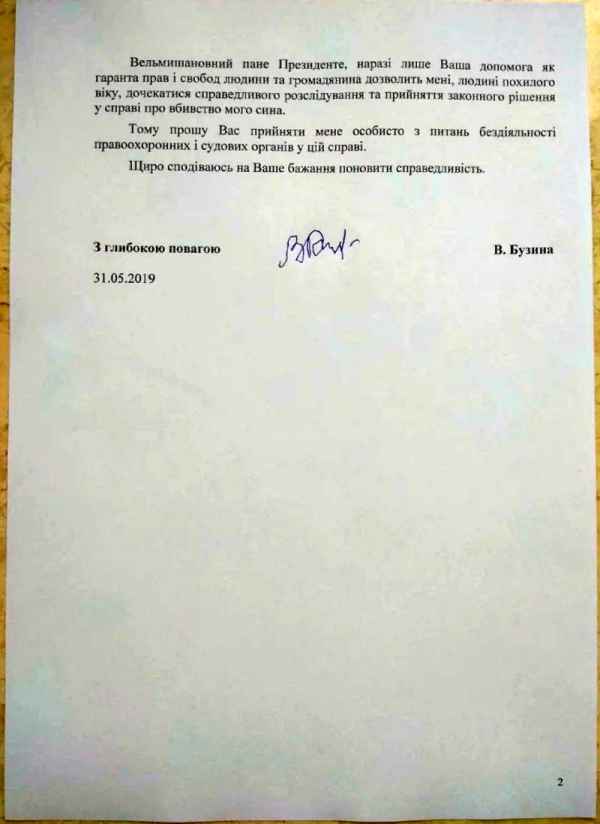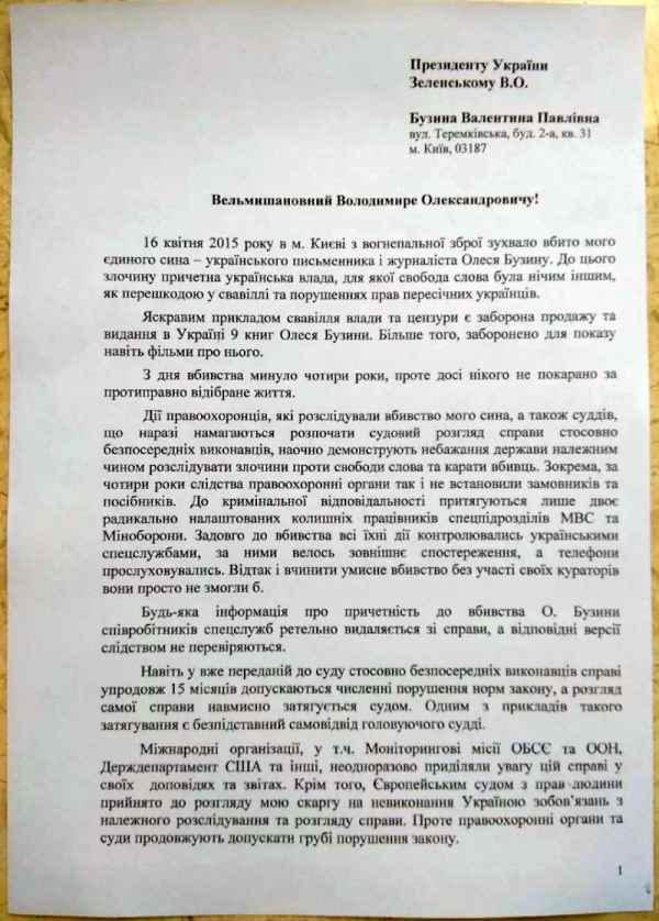 Именно 1 июня сего года стало известно, что Валентина Бузина, мать убитого в апреле 2015 года журналиста и писателя Олеся Бузины, обратилась с открытым письмом к президенту Зеленскому. И в этом документе материнского отчаяния и безысходности обвинила именно правоохранителей их спецслужб и в причастности к убийству ее сына, и в намеренном сокрытии следов преступления, и в умышленном торможении наказания преступников-убийц, которым умышленно не «доказывают» вину и они свободно гуляют по Киеву. Разумеется, как герои. И майдана, и АТО.