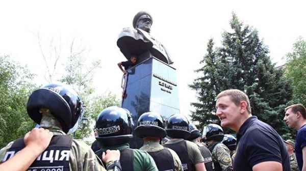 Штурмовики «Нацкорпуса», «Правого сектора», «Фрайкора» сбросили на землю находящийся неподалёку памятник одному из освободителей Харькова маршалу Георгию Жукову. На «освободившееся» место водрузили желто-блакитный флаг, с постамента сбили надпись, скандировали «Україна понад усе!» (калька немецкого «Германия превыше всего»). Аваковская полиция, по обыкновению, почти не сопротивлялась аваковским «нацдружинам»: от своего бывшего «земляка» харьковчане получили привет в виде очередной порции беспредела.