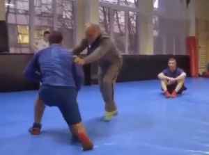 Этот пожилой тренер лишний раз доказывает, что молодость не всегда является решающим фактором в поединке. Его ловкости и координации можно только позавидовать.