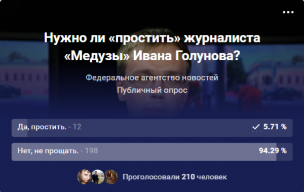 Призывы либеральной тусовки освободить задержанного журналиста Meduza Ивана Голунова общественность не поддерживает. Народное мнение по этому поводу установлено в ходе опроса, проведенного Федеральным агентством новостей на официальной странице «Вконтакте».