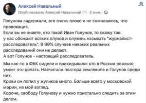 Как и предполагалось, в своем посте блогер не упомянул о том, что сотрудники правопорядка поймали Голунова с поличным. О том, что при задержании у него нашли 4 грамма метилэфедрона, а позднее еще 5 грамм кокаина в съемной квартире. Вместо того, чтобы осудить сотрудника «Медузы», Навальный попытался выставить публициста отличным специалистом.