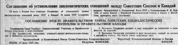 Канада и СССР установили дипломатические отношения уже в ходе Второй мировой войны, а именно - 12 июня 1942 г.