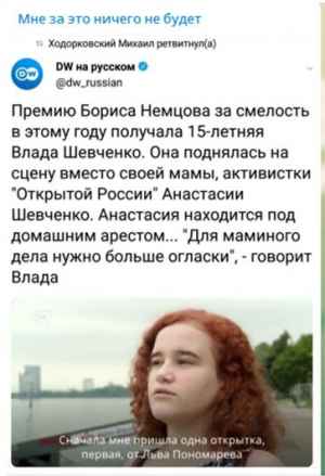 Шестнадцатилетняя Влада, дочка активистки «Открытой России» Ходорковского Анастасии Шевченко, удостоилась награды. Ей вручена премия Немцова.