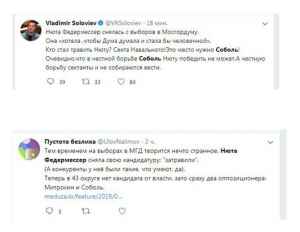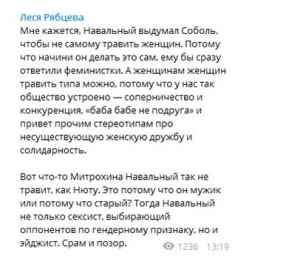 Причины подобного поведения Навального и его ставленницы очевидны: пустышка Соболь не имела никаких шансов победить известную общественницу. Аморальный блогер поступил в соответствии со своей подлой натурой, устроил травлю и заставил достойную женщину отказаться от участия в выборах.
