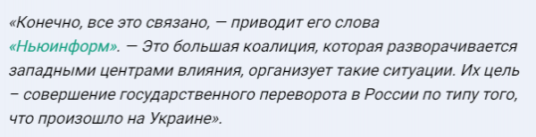 Кроме этого, Марков провел параллели между событиями на Украине и акцией оппозиции в День России. Обращая внимание на многочисленные сходства этих событий, политолог утверждает, что они организованы западными кураторами.