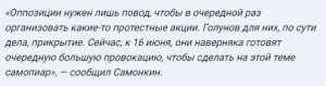 Его мнение основано на том, что Голунов оправдан, а в отношении задержавших его сотрудников полиции проводится внутреннее расследование. Кроме этого эксперт обращает внимание на то, что организаторы митингов в День России не прислушались к призыву журналиста не участвовать в несанкционированной акции. По мнению Самонкина это может означать только то, что оппозиционерам нужен повод для самопиара, а до самого Ивана Голунова им дела нет.