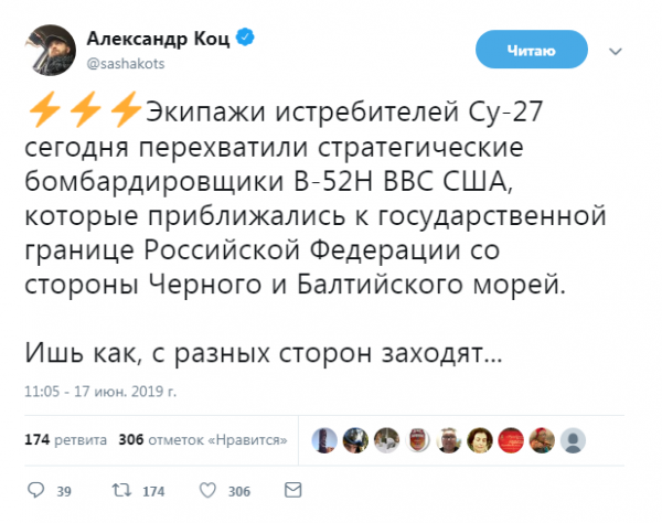 В понедельник, 17 июня, на подходе к границам России со стороны Балтийского и Чёрного морей российские Су-27 "перехватили" бомбардировщики ВВС США. "Ишь ты, с разных сторон заходят, а если нервишки не выдержат?" - предположили пользователи Сети, комментируя очередной пролёт ВВС США у российских границ.