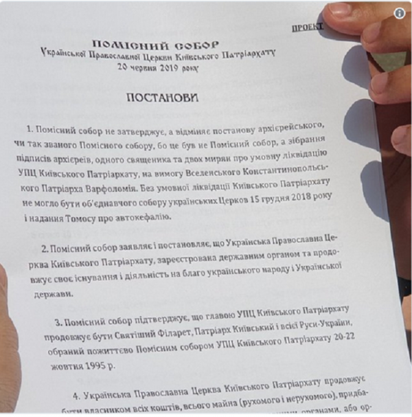 «Это был не поместный собор, а собрание подписей архиереев, одного священника и двух мирян об условной ликвидации УПЦ КП по требованию вселенского Константинопольского патриарха Варфоломея... Поместный собор заявляет и постановляет, что УПЦ КП, зарегистрированная государственным органом, продолжает существование и деятельность», — говорится в тексте решения.