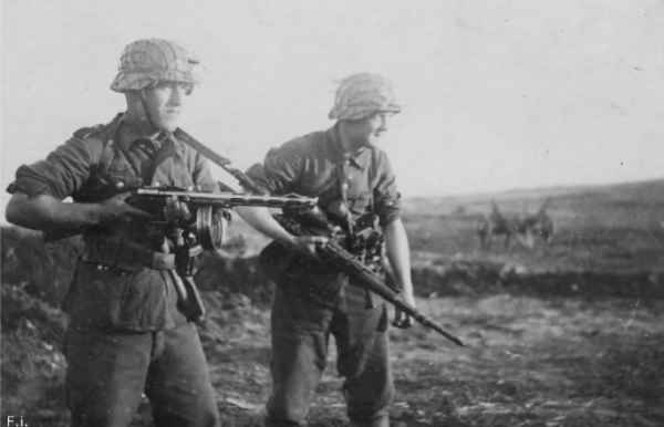 Активно использовали немцы и советский пистолет-пулемет ППШ. Хотя ППШ и немецкий MP.40 относятся к одному классу стрелкового оружия, разница между ними очень велика. В советском ППШ использовался более мощный патрон, за счет чего прицельная дальность составляла 200 м, и реально стрелять можно было до 500 м. Немецкий MP.40 хоть и имел калибр 9 мм (в советском 7.62 мм), но реально из него стреляли от силы на сотню метров. Немецкий пистолет-пулемет изначально создавался для экипажей бронемашин, а относительно массовым стал из-за своей дешевизны и простоты производства. Никаких подразделений автоматчиков в вермахте никогда не было. Пистолетом-пулеметом MP.40 в немецком стрелковом отделении вооружался только командир, остальные бойцы имели карабины. А вот советский ППШ немецкие пехотинцы применяли успешно и охотно. В вермахте ППШ получил наименование Maschinenpistole MP 717(r).