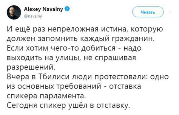 Можно было не сомневаться, что Алексей Навальный с одобрением отнесется к протестам в Грузии. Что и подтвердилось: блогер в своем Твиттере заявил о поддержке провокаторов.