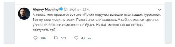 Еще более циничным является пост блогера, в котором он критикует указ президента РФ о приостановке авиасообщения с Грузией и вывозе россиян-туристов из этой страны в связи с опасностью стать жертвами гражданского противостояния.