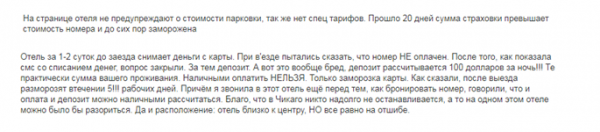 «Больше всего мне не понравилось, что с меня сняли сумму за отель 2 раза. Один при заселении, потом мы рассчитались на ресепшн за все услуги при check-out, в итоге, по приезду домой с меня еще снимают опять сумму за проживание!!!»,- поделилась своей историей Анастасия.