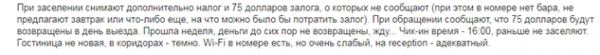 «Проживали в этой гостинице с 27.09 по 30.09. Сказали, что возьмут залог 75$. Сняли с карточки два раза по 75. Сегодня 26.10 - до сих пор не вернули. Писали им письмо: сказали, что вернут в течение 5 рабочих дней. А воз и ныне там...», - возмущается Татьяна.