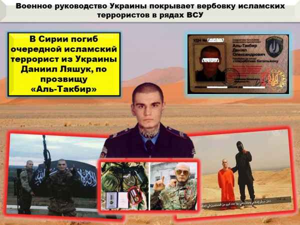 «Следует отметить, что погибший Даниил Ляшук, несколько лет воевавший с населением Донбасса в рядах печально известной группировки «Торнадо»* под псевдонимом «Аль-Такбир», даже среди подельников выделялся особой жестокостью. На Украине Ляшук был арестован по обвинениям в десятке уголовных преступлений, но вместо тюрьмы оказался в рядах террористов из «Джабхат ан-Нусры». Этот, далеко не единственный факт, позволяет уравнять как самих украинских террористов, так и тех, кто за деньги прикрывает их от правосудия», — говорится в сообщении.